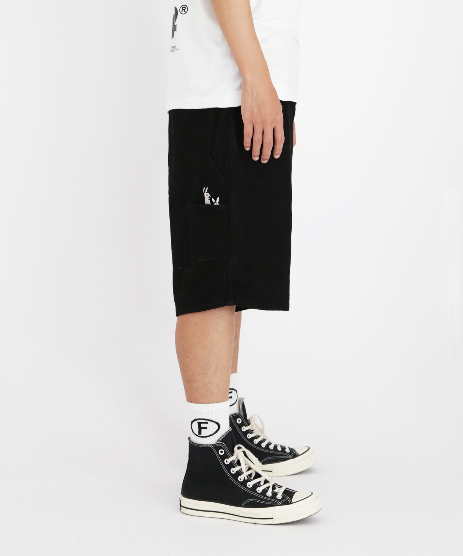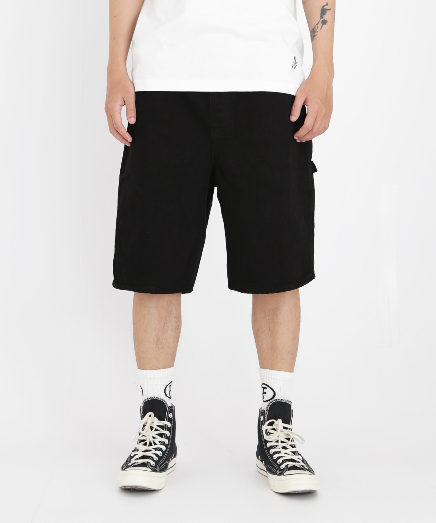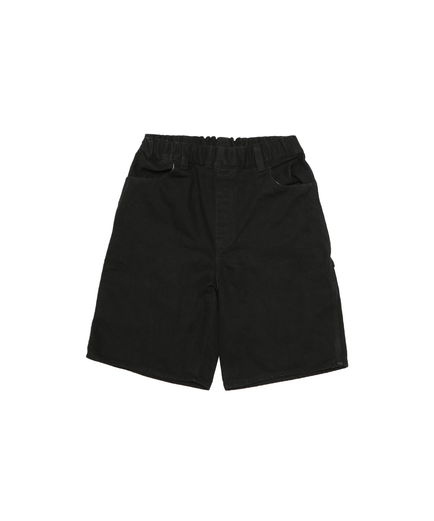 デニム生地で深めの股上やハンマーループ、スパナポケット等ペインターパンツの特徴を取り入れたショートパンツ。ウエストはゴム紐を通してあり調整可能。 バックポケットから顔を出しているアイコンの刺繍がアクセントにもなりつつ、コーディネートで使いやすい一本。 サイズに関して・・・ウエスト(ゴム紐入り) M 約77.0 ~ 83.0 L 約80.0 ~ 88.0 XL 約83.0 ~ 91.0 ※単位:cm 型番:FRP293