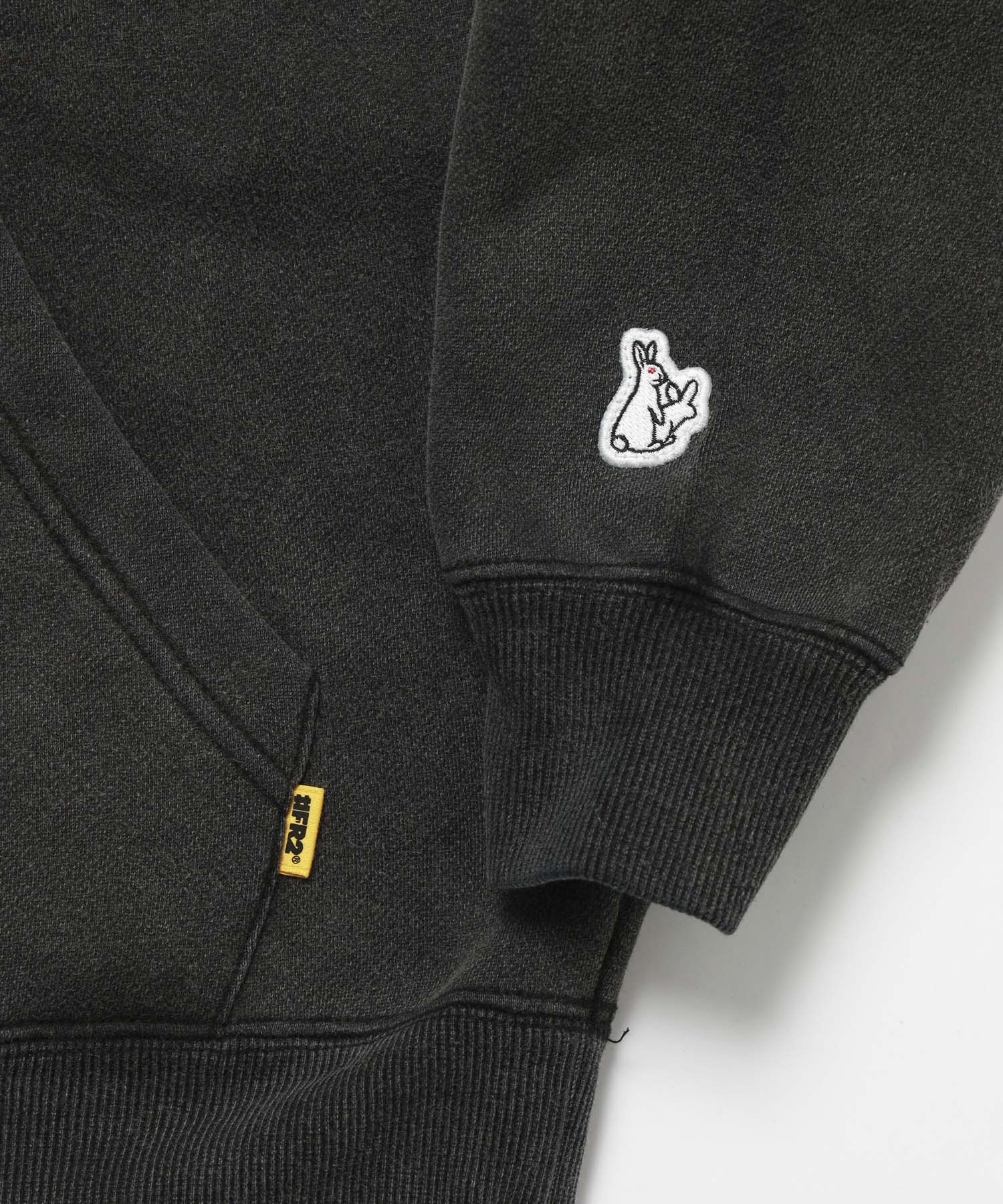 薬品で色を落としつつ洗いをかけた生地でヴィンテージ感のあるボディーに、クロスを背にハートを抱えたウサギのグラフィックをあえて掠れたような風合いでバックに落とし込んだ一枚。フロントはワンポイントでロゴ刺繍入り。 温もりのある起毛素材で春先まで活躍出来るアイテム。 型番:FRC3886 ※着用時や洗濯時にプリントが剥がれる可能性があります。不良ではありませんので返品交換等の対応は一切お受けすることが出来ません。予めご了承下さい。