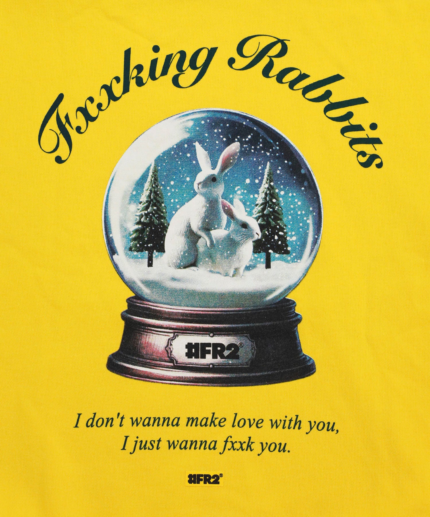 スノードームの中にリアル風なウサギのアイコンにロゴを組み合わせたグラフィックをバックに大きめに落とし込んだTシャツ。フロントは左胸にロゴを刺繍でオン。 温もりのある起毛素材で着心地も良く、季節感のあるデザインで上着を脱いだ際に見えるグラフィックがアクセントにもなります。 型番:FRC4020
