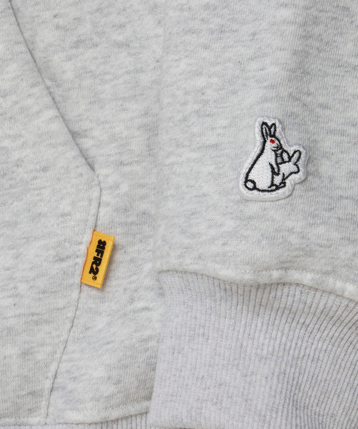 ライトアウター感覚でさらっと羽織ることもできるジップパーカー。程良い厚みと起毛素材で温もりもあり着心地も良好。 フロントはポップな雰囲気のウサギを刺繍しつつ、バックに大きめにプリントで落とし込み存在感もある仕上がり。 型番:FRC4022