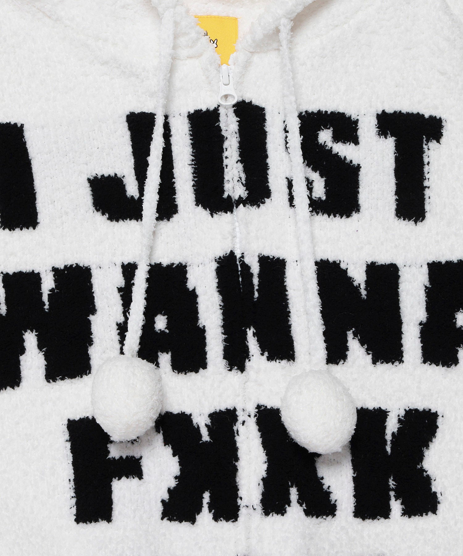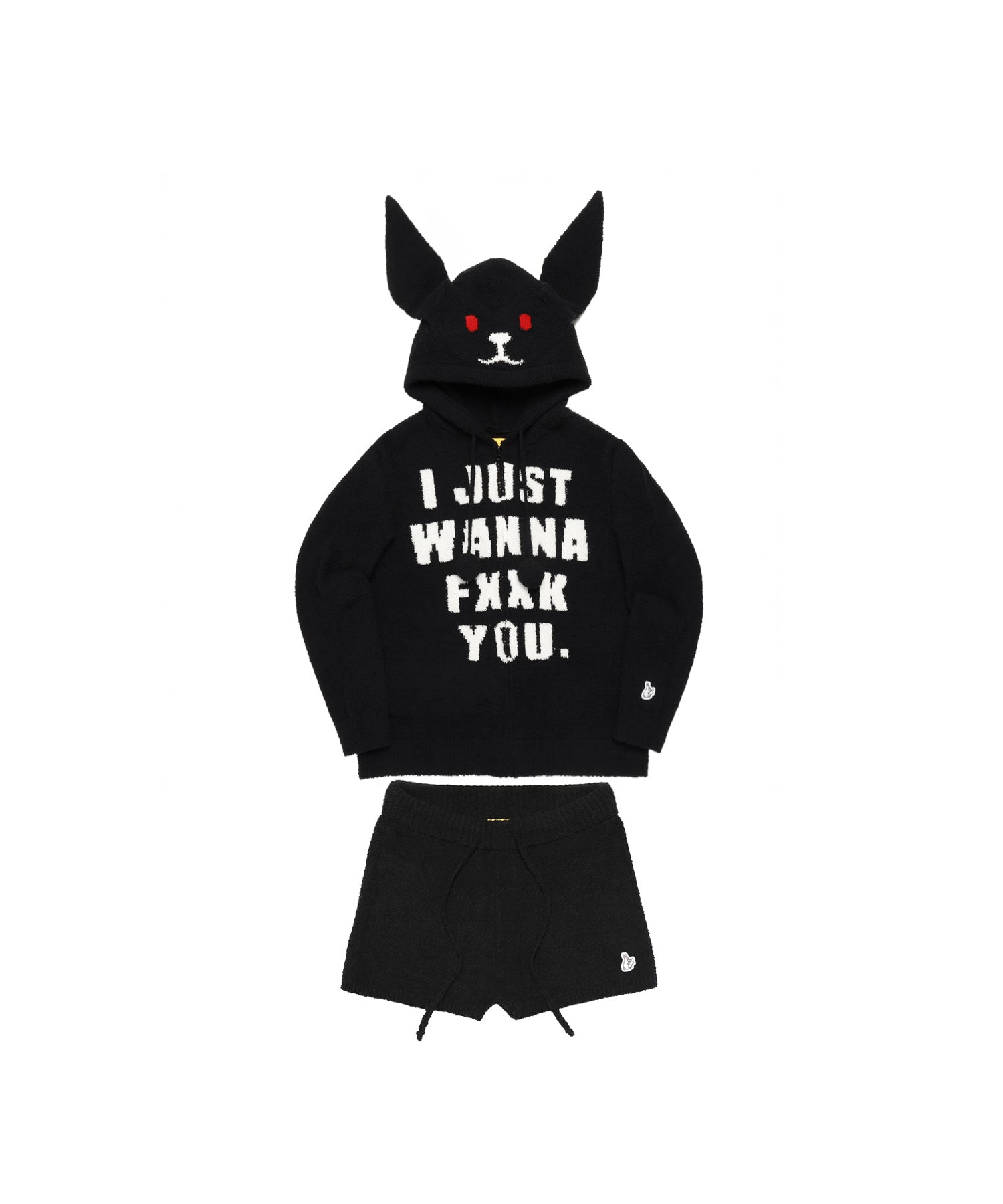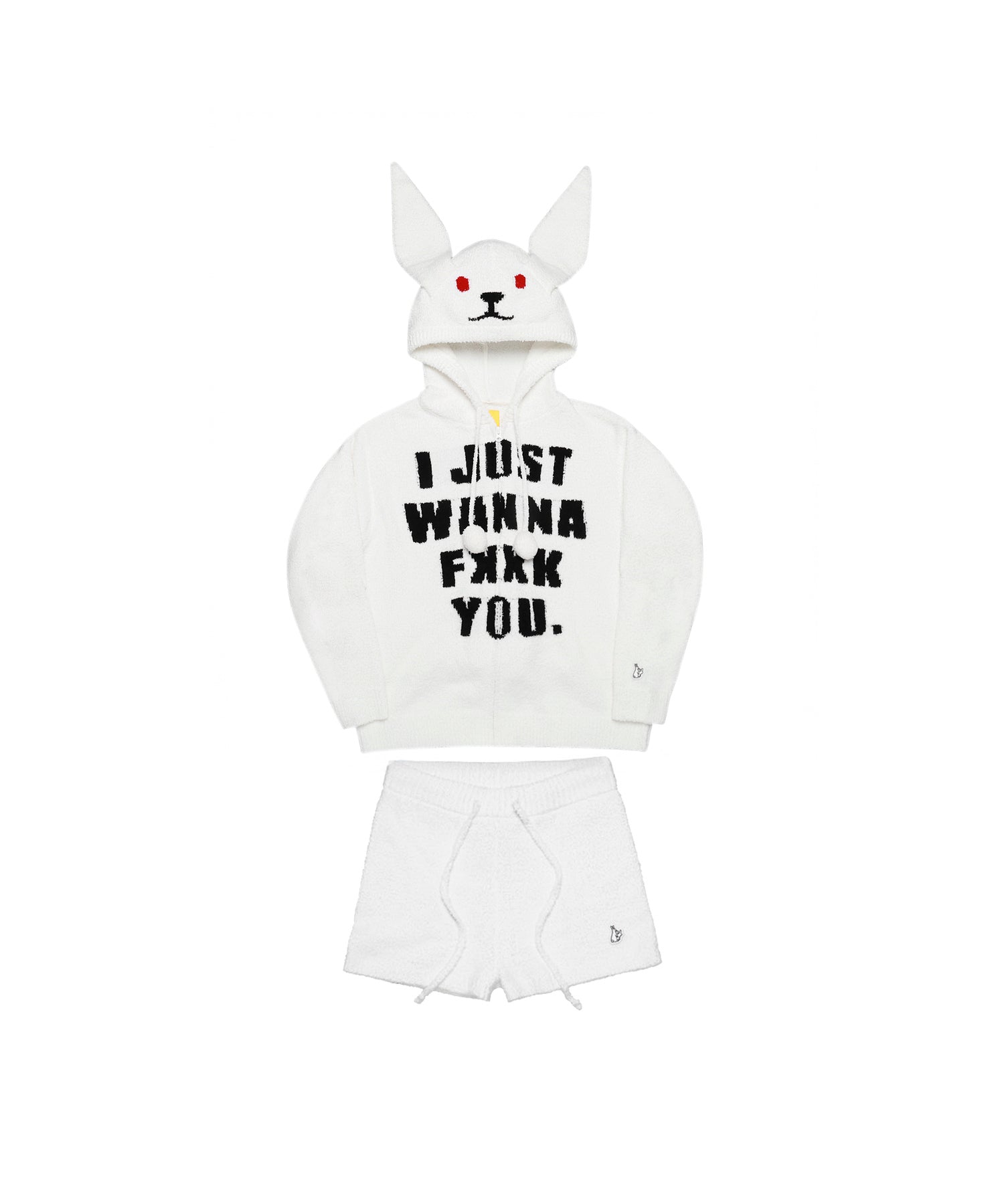 フロントにジャガード織で、”I JUST WANNA FXXK YOU”のメッセージが落とし込まれた、もこもこ素材で着心地翌快適で部屋の中でもお洒落を楽しめるようなセットアップ。 タオルのようなふわふわの手触りで柔らかさと暖かさを併せ持ったショーツとパーカーのセットのルームウェアになっていて、フードはウサギの耳付で被った際にうさ耳や顔までアイコン仕様になるのもポイント。また、ちょっとした外出時や普段着として単品でコーディネートに取り入れたりと使い方は多様。 カラーはホワイトとブラックのモノトーンカラーで統一。 ※こちらはウィメンズサイズとなります。 ウエスト(調整可):約72.0 ~ 104.0cm 型番:FRG029