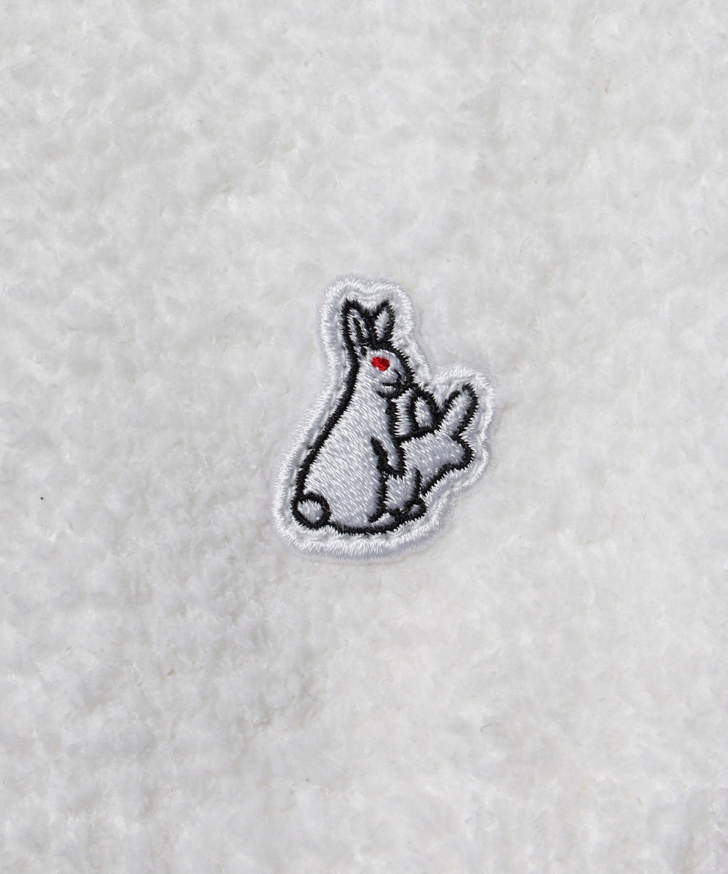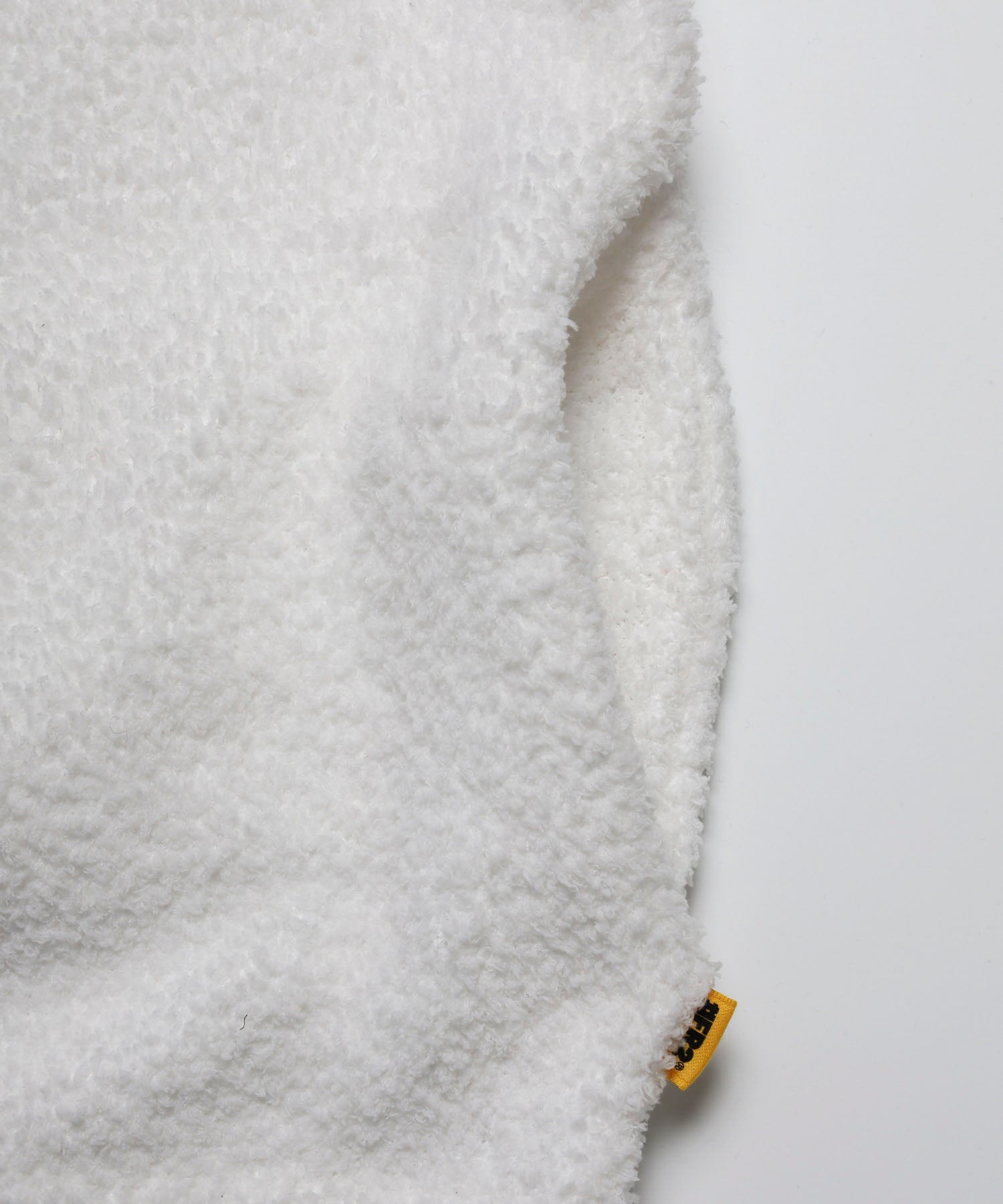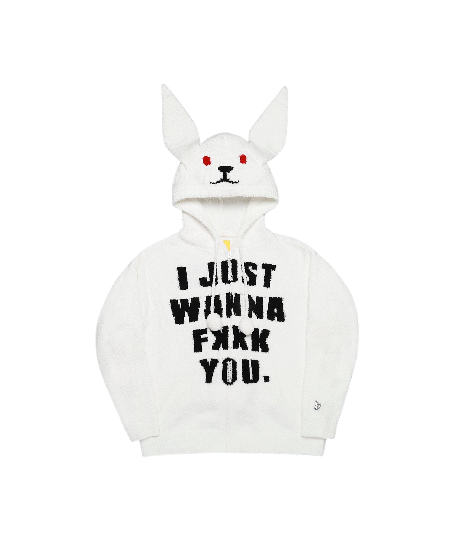 フロントにジャガード織で、”I JUST WANNA FXXK YOU”のメッセージが落とし込まれた、もこもこ素材で着心地翌快適で部屋の中でもお洒落を楽しめるようなセットアップ。 タオルのようなふわふわの手触りで柔らかさと暖かさを併せ持ったショーツとパーカーのセットのルームウェアになっていて、フードはウサギの耳付で被った際にうさ耳や顔までアイコン仕様になるのもポイント。また、ちょっとした外出時や普段着として単品でコーディネートに取り入れたりと使い方は多様。 カラーはホワイトとブラックのモノトーンカラーで統一。 ※こちらはウィメンズサイズとなります。 ウエスト(調整可):約72.0 ~ 104.0cm 型番:FRG029