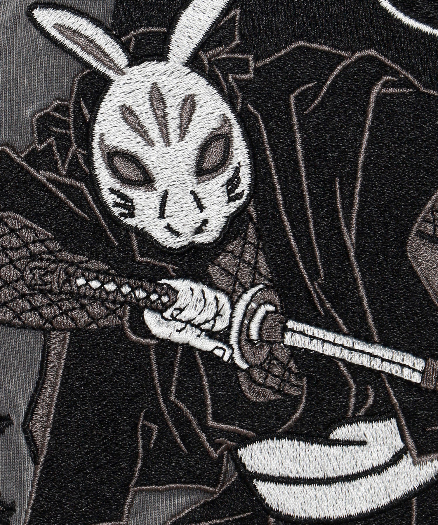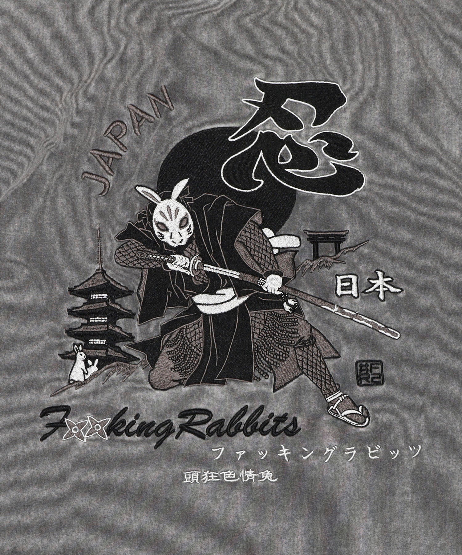 ウサギのお面をつけた忍者をメインに日本の夜の風景やアイコンをバックに刺繍で落とし込んだTシャツ。フロントは「忍」の文字とロゴをそれぞれ刺繍で表現。 存在感もありつつキャッチ‐な仕上がり。 型番:FRC4137