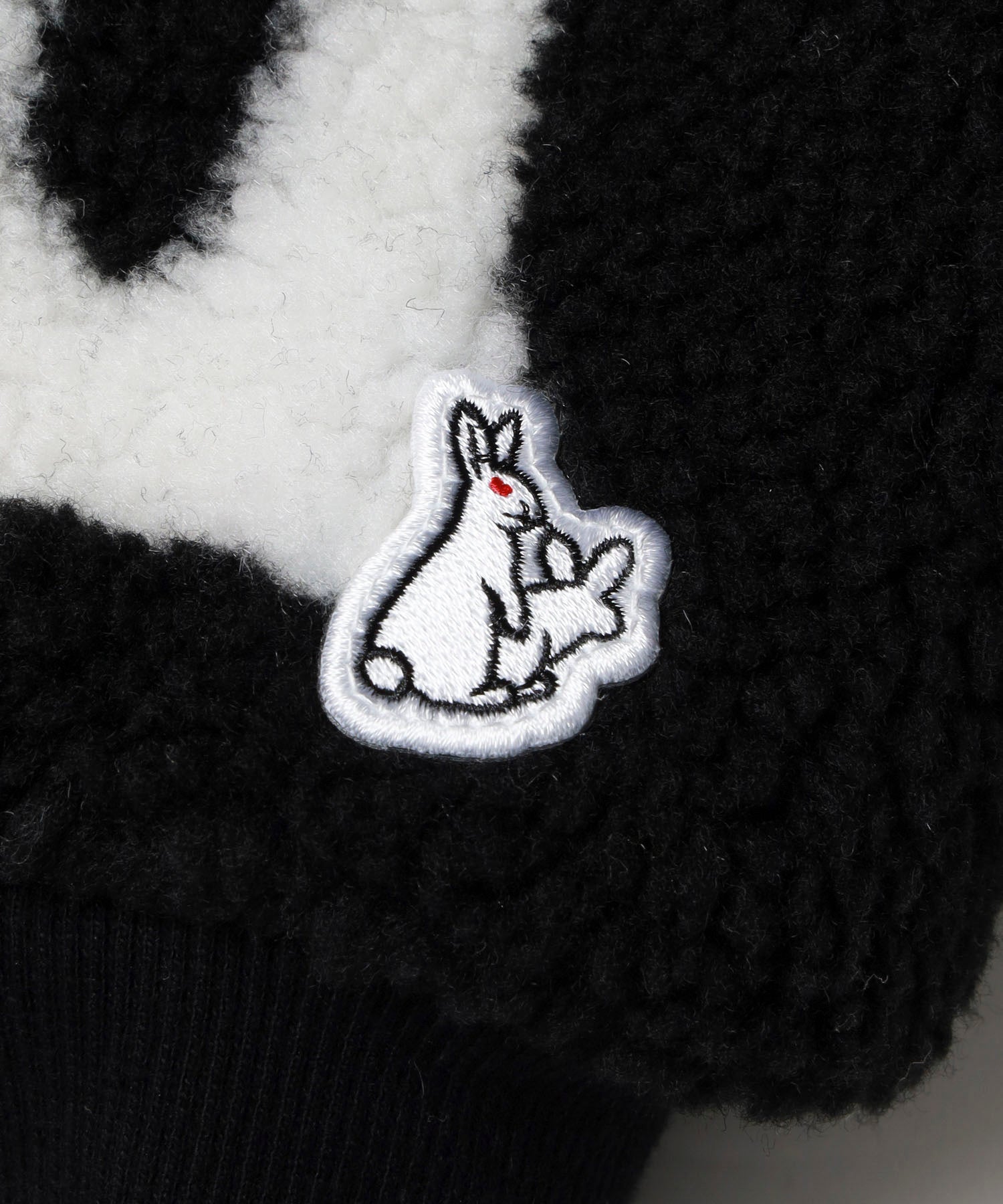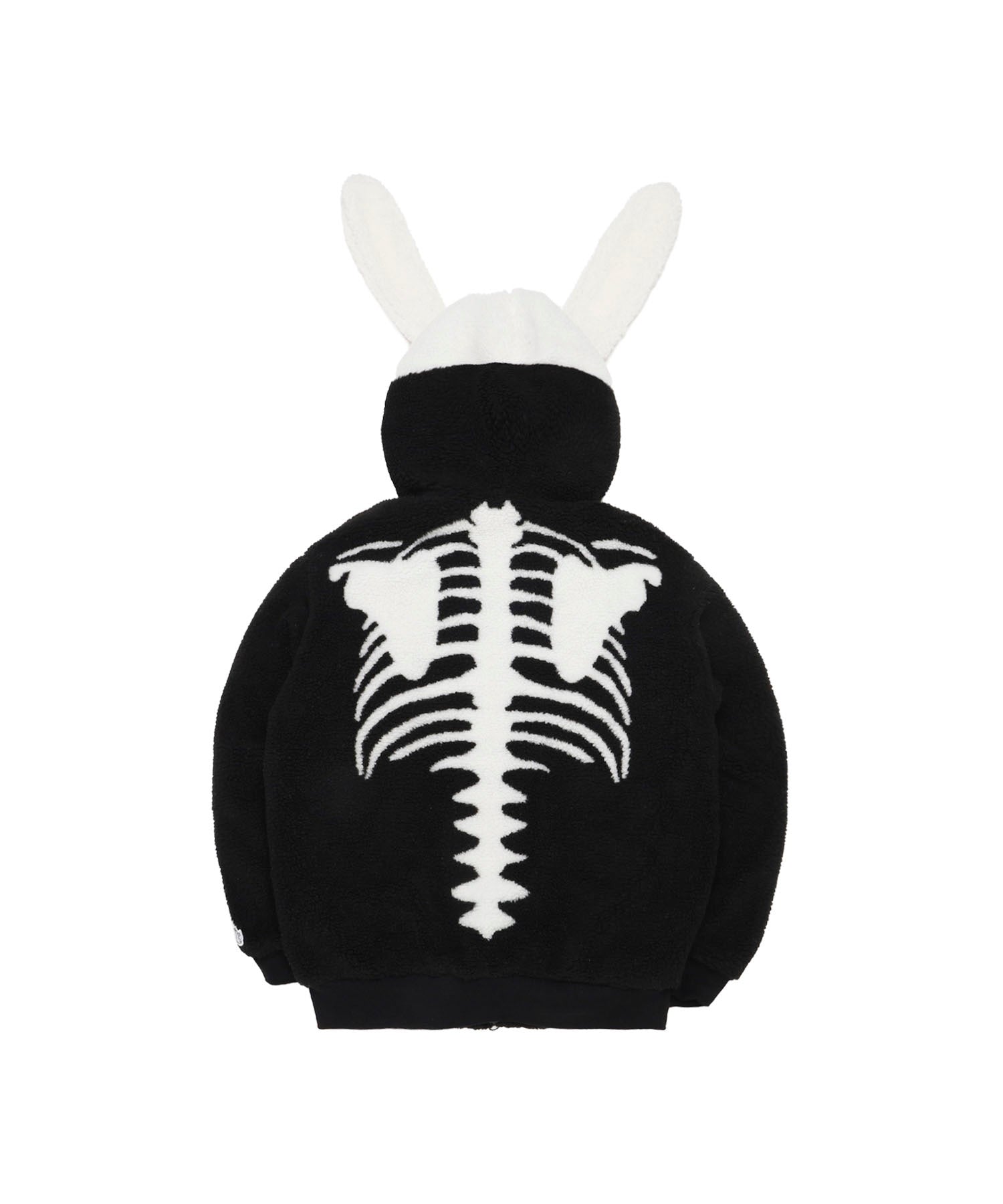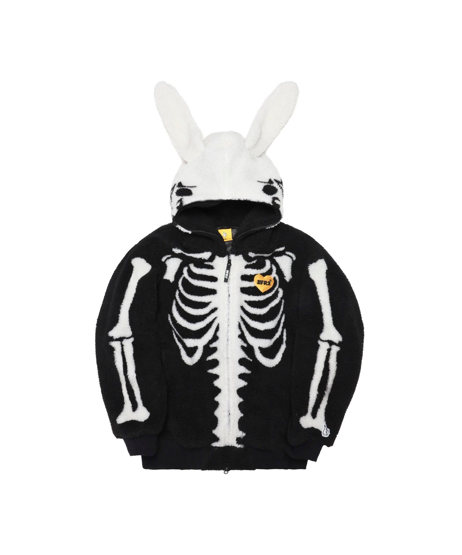 温もりのあるボアフリース仕立てのジップブルゾン。 フードはうさ耳の形状で、さらにフード部分までジップを取り付けることで全閉した際にスケルトンのウサギのようになっていたり等に加え、左胸にはハートの中にロゴを刺繍したり遊び心のある仕上がり。 ホワイトとブラックのモノトーンの配色ながらしっかりと目を惹く一着。 同素材・同デザインのパンツとセットアップでも楽しめます。 型番:FRC4266