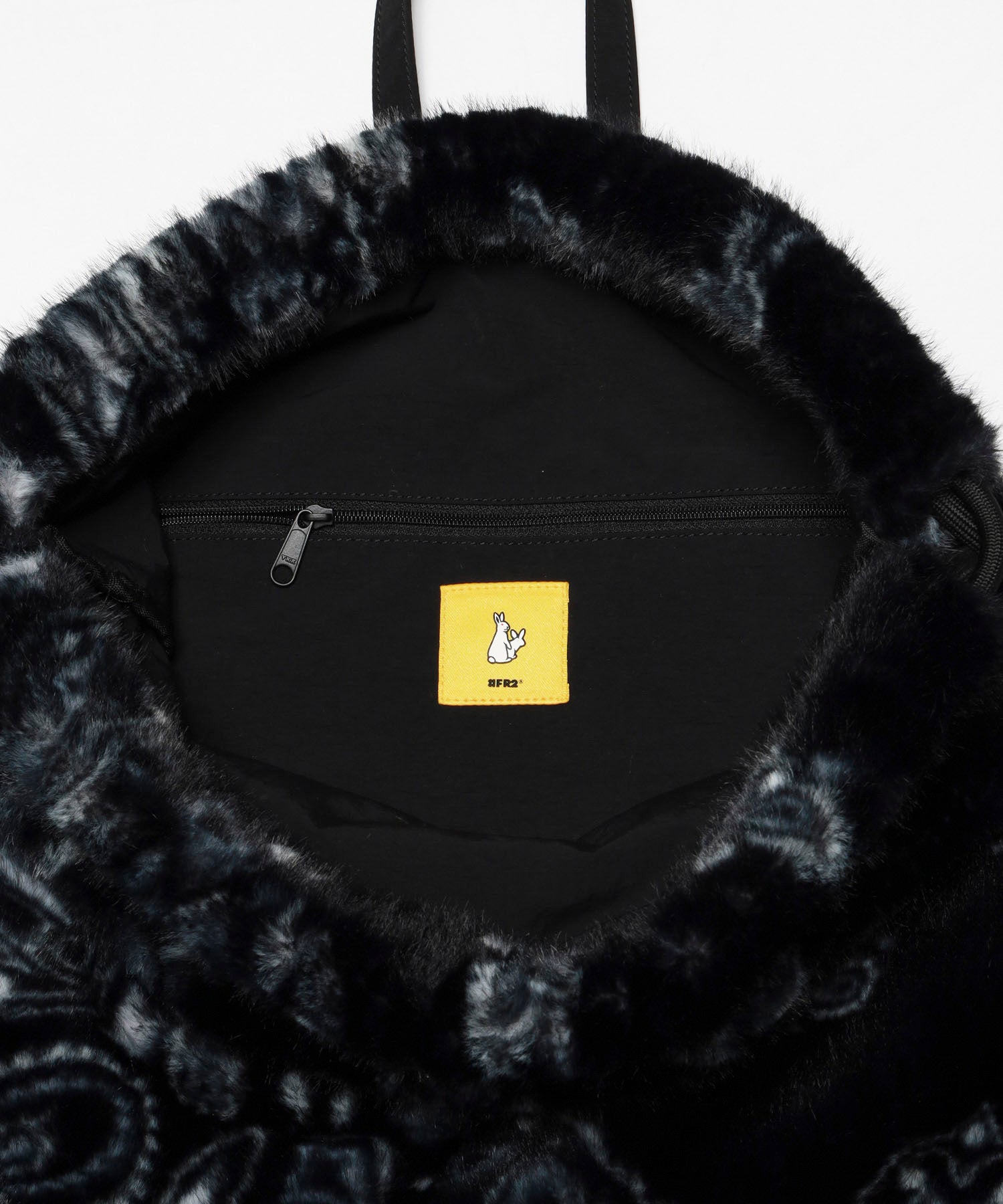 ブラックをベースにオリジナルのペイズリー柄を落とし込んだナップサック型のバックパック。大きすぎず休日の外出時にも使いやすいサイズ感に加え、内側にジップポケットを取り付け機能面もプラス。程良い毛足の長さで柔らかさもありながら滑らかで肌触りが良いエコファーを使用し、ファッション性もあるのでコーディネートのプラスワンとしても活躍出来るアイテム。 型番:FRA1990 持ち手の長さ・・・約35.0cm