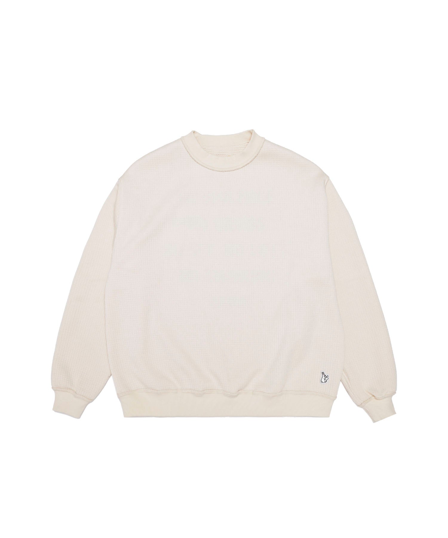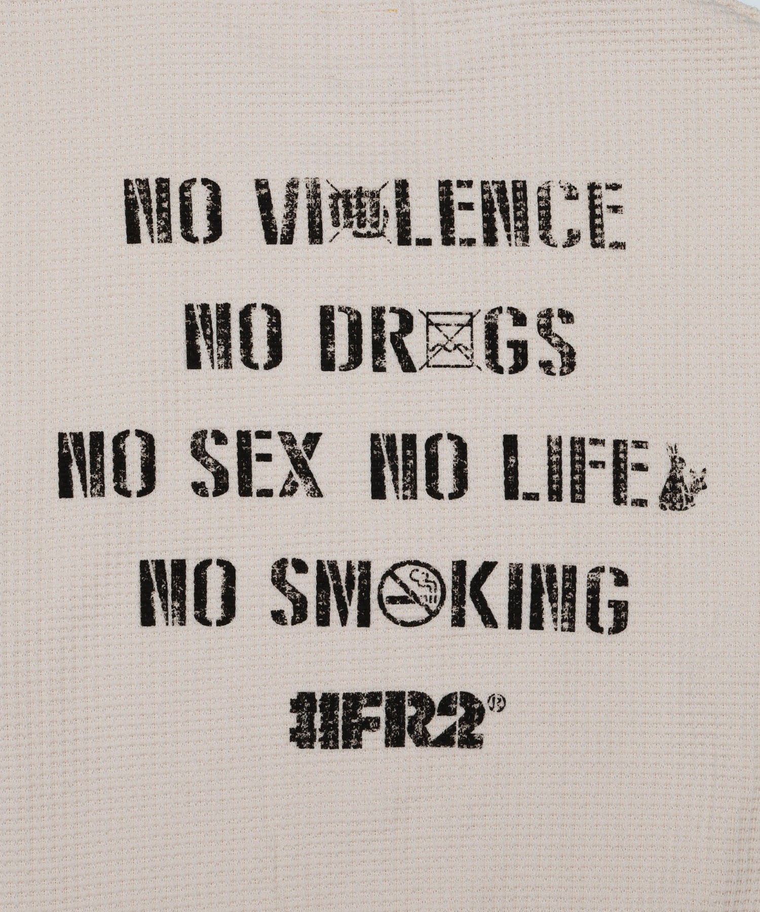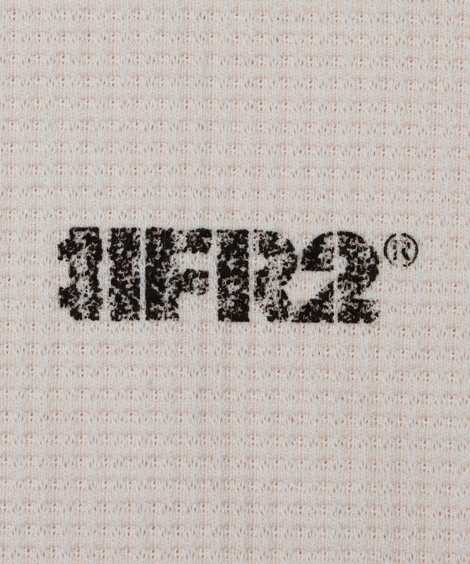 表面に凹凸のあるワッフル素材のトップス。バックに掠れたような風合いのメッセージやロゴをプリント。フロントにはワンポイントロゴ。リバーシブルタイプ。 型番:FRC4352