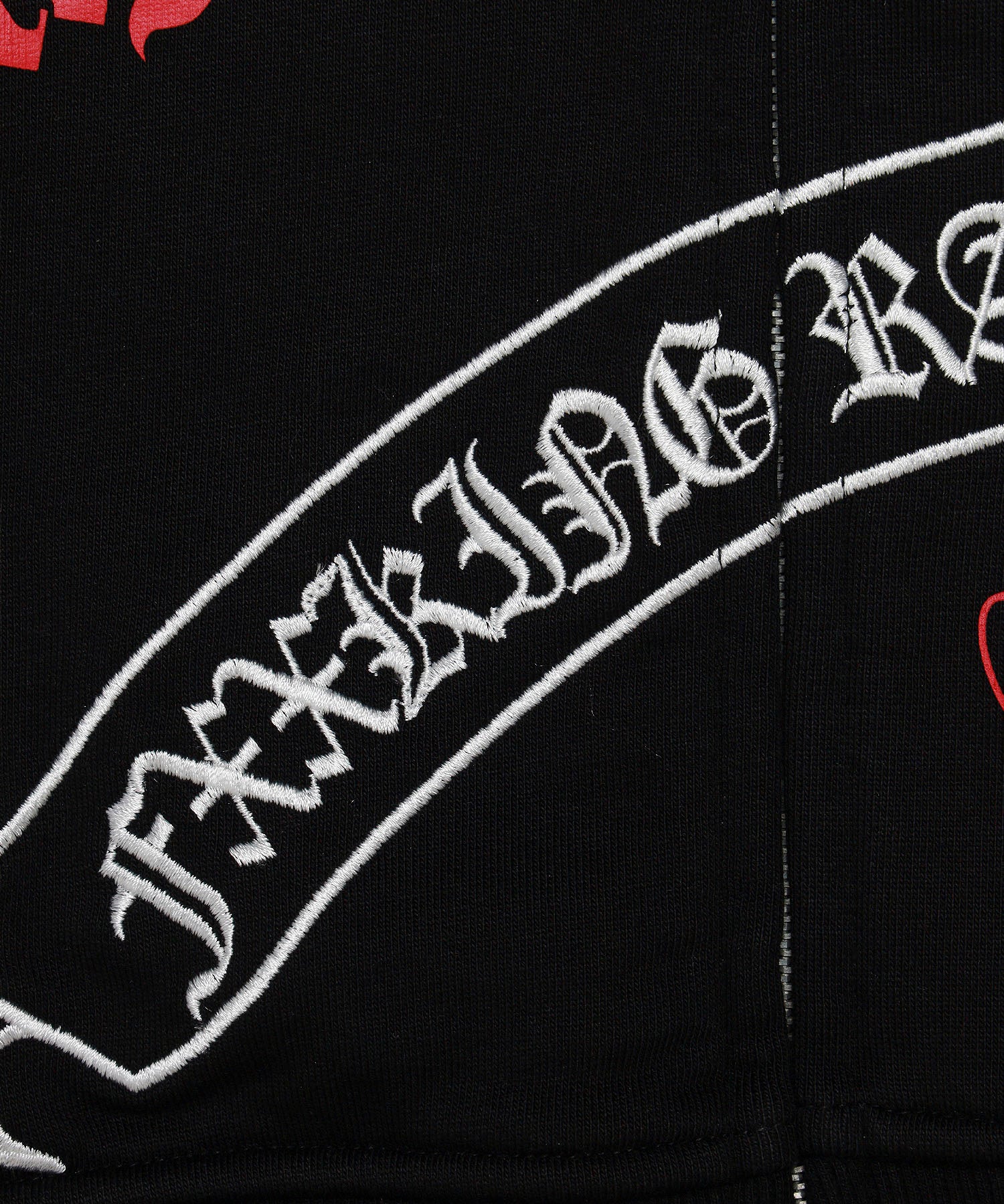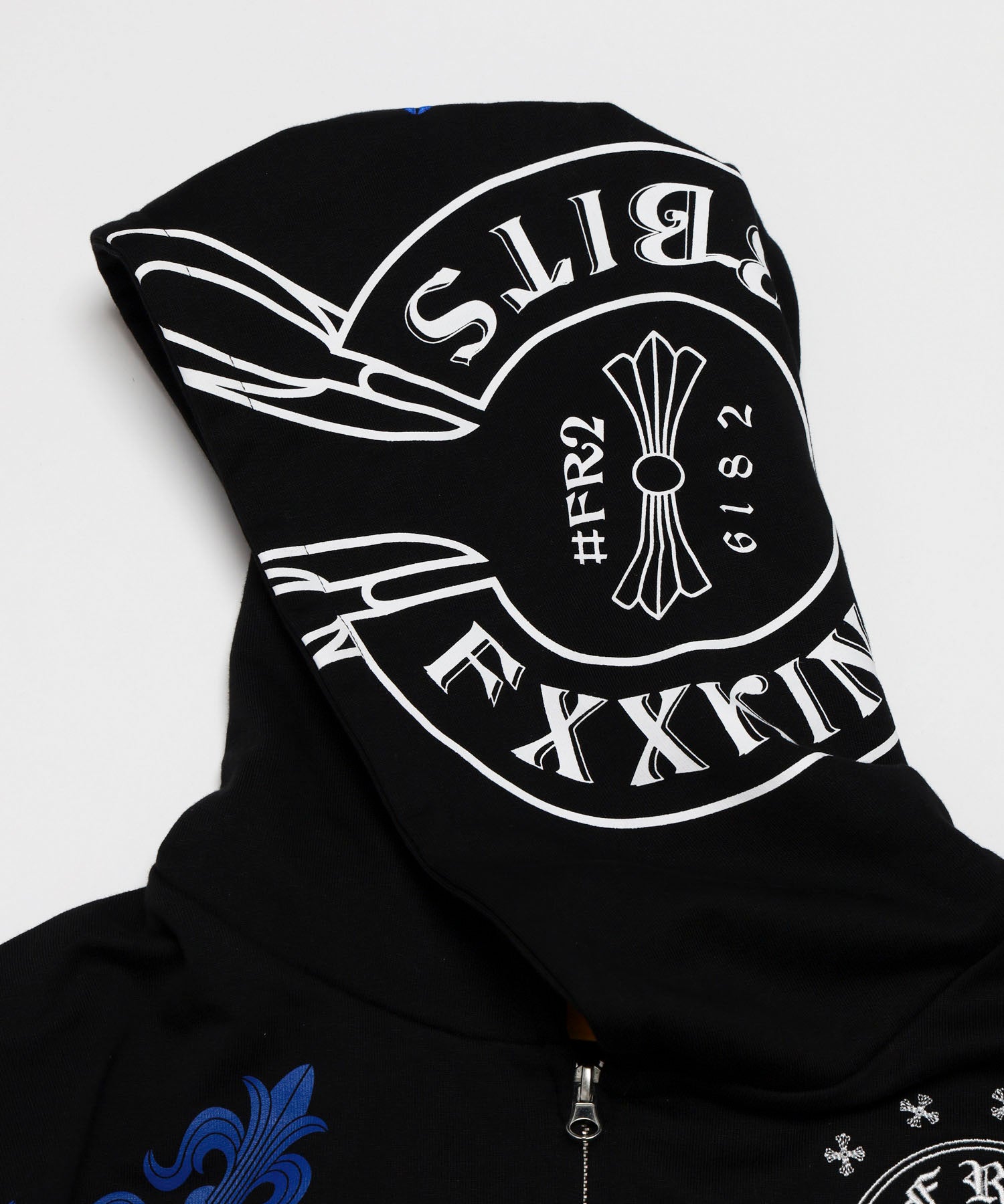 刺繍とプリント双方用いてフード含めたボディ全体に総柄でロゴやグラフィックを落とし込んだジップフーディー。柔らく着心地の良い裏毛素材。 型番:FRC4416